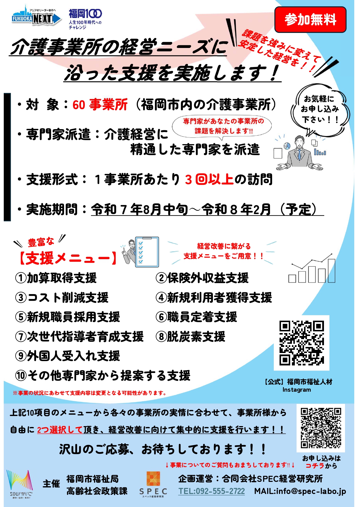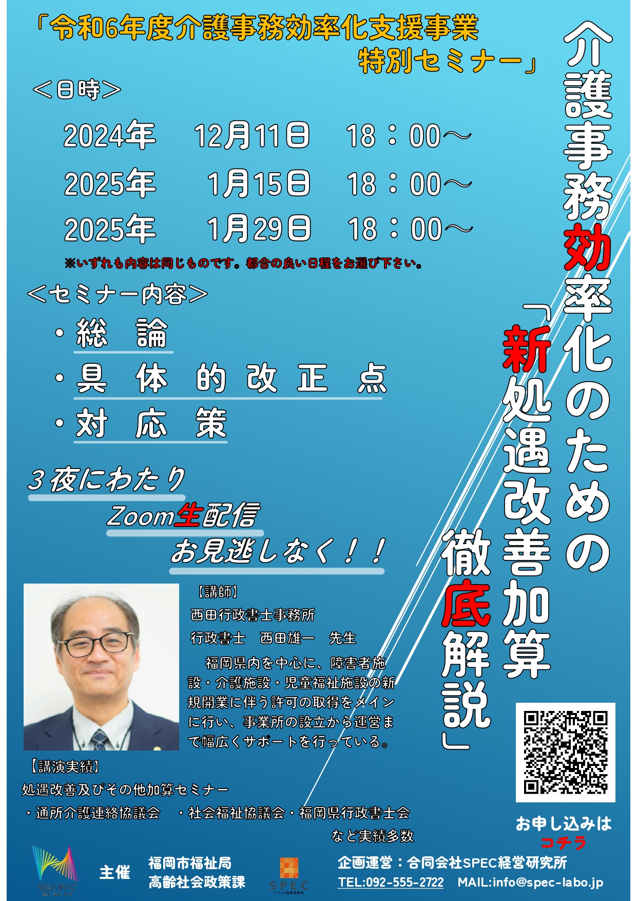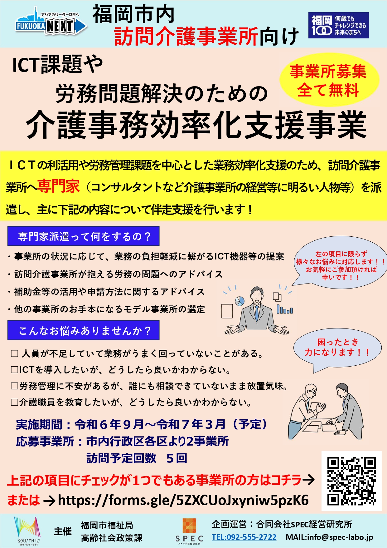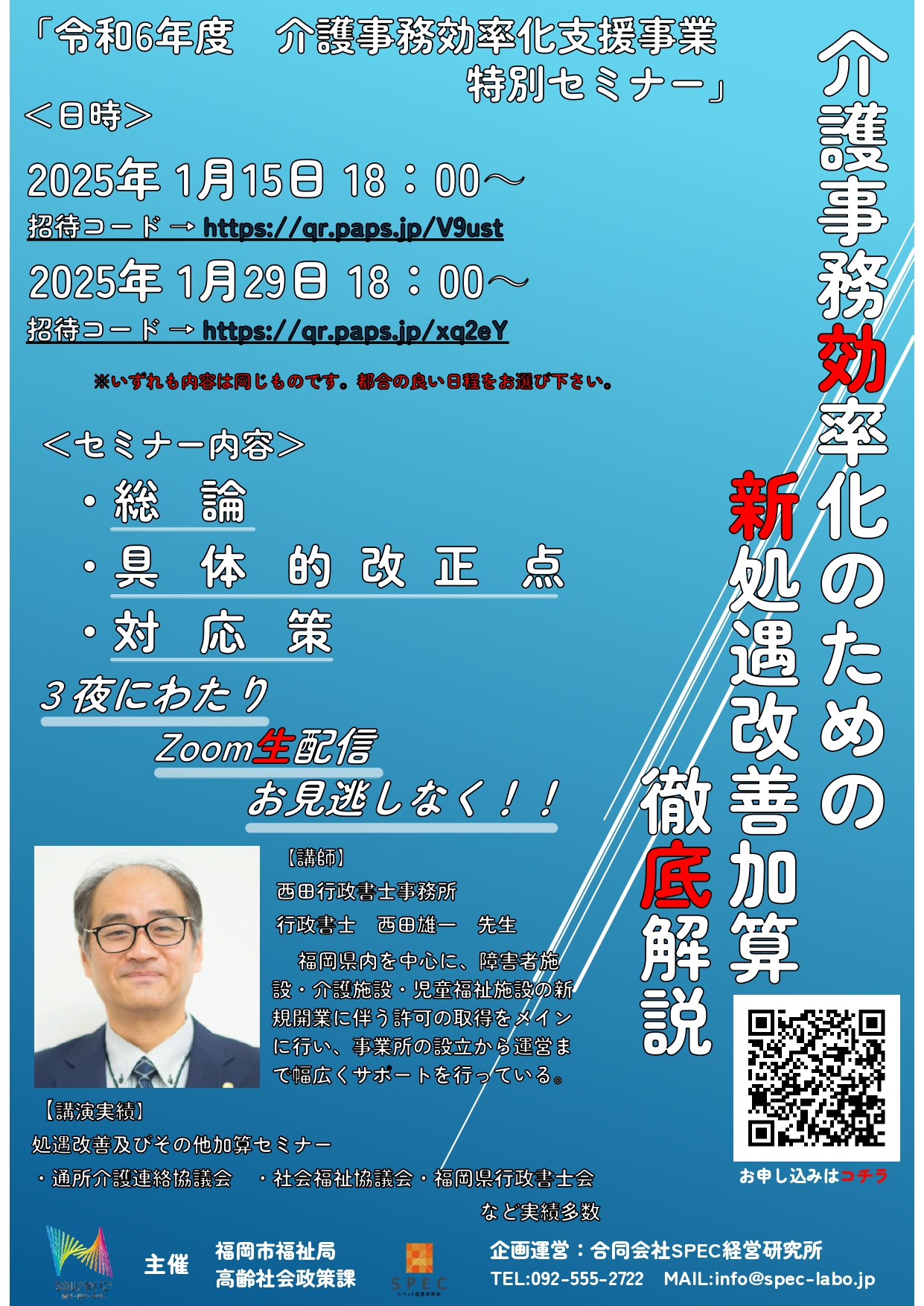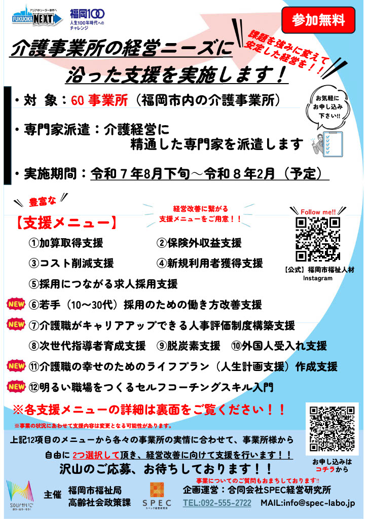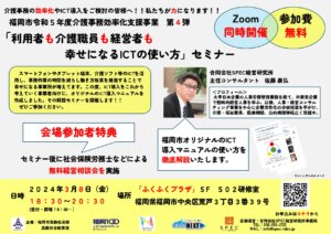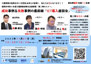 【重要】福岡市主催「令和5年度介護事務効率化支援事業」第2弾セミナー動画配信 前回の第1弾セミナーに引き続き、11月27日に福岡市主催「令和5年度介護事務効率化支援事業」第2弾セミナー「成功事例&失敗事例の最前線~ICT導入座談会~」を開催致しました。当日参加が出来なかった方々のためにYoutubeにて動画配信を行っておりますのでご覧ください!!