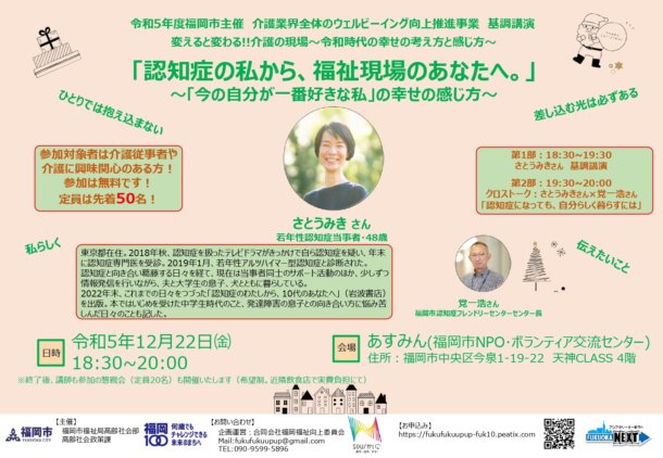 福岡市主催【認知症の私から、福祉現場のあなたへ。 ~「今の自分が一番好きな」私の幸せの感じ方~】講演会を開催いたします。